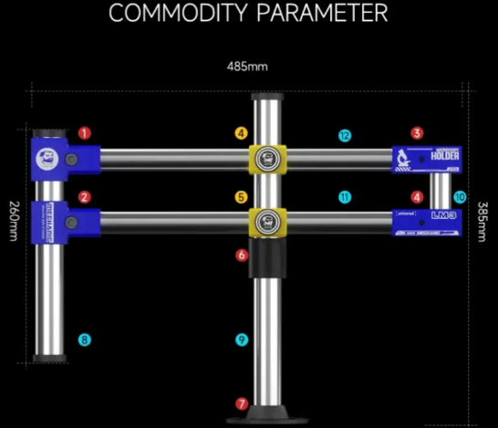 The MC LM3 Universal Double Arm Bracket is a flexible, 360° rotating support mount made for holding magnifying lenses, microscopes, or inspection stations over a work area. Its dual arms allow adjustable positioning in multiple axes, enabling precise alignment and stable holding of optical devices. The solid metal construction ensures durability and vibration resistance, while joints and pivot points provide smooth movement and reliable locking in place.