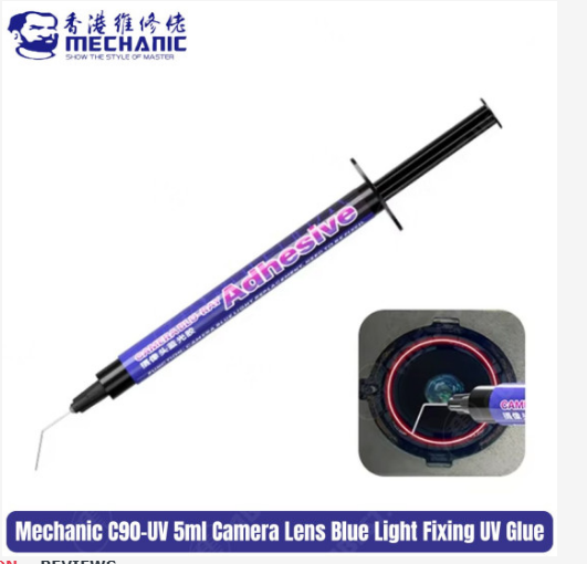 The MC C90-UV Camera Blue Light Adhesive is a high-transparency UV-curable glue designed for bonding camera lenses, screens, and optical components. It provides strong adhesion under UV or blue light curing, forming a clear, durable bond that resists yellowing, moisture, and temperature fluctuations. Its fast-curing and non-shrinking properties make it ideal for precision work in mobile phone camera repair, lens assembly, and other optical bonding applications.