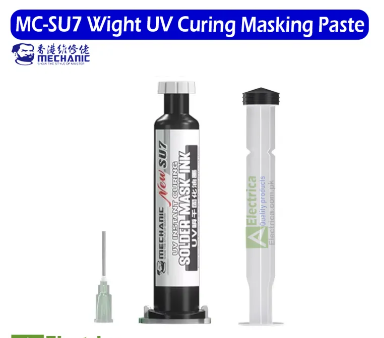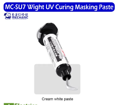 The MC SU7 White UV Curing Masking Paste is a high-quality UV-curable compound used to protect circuit areas and components during soldering, reflow, or coating processes. It cures quickly under UV light to create a strong, flexible white coating that resists heat, moisture, and oxidation. The bright white colour enhances visibility during application, making it ideal for precision PCB repair, coating, and insulation work in electronic manufacturing and servicing.