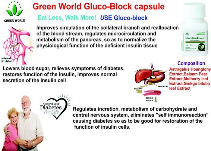 After the Incidence of Diabetes, a Series of Turbulence of Sugar, Protein, Fat, Water and Electrolyte Happen. A Large Amount of Glucose is Discharge Through Urine. At the Same Time, There are Symptoms Such as Excessive Drinking Urination and Eating, Severe Weight Loss, Dizzy and Fatigue. If not Controlled, Severe Acute OR Chronic Complication Throughout the Body will be Aroused. Chronic Complication may Happen to the Eyes, Kidneys, Nerve, Skin, Blood Vessel and Heart. Finally, Blindness, Lower Limbs Gangrene, Uremia, Brain Stroke and Cardiac Infarction Happen, Which Endangers Human Beings Health Seriously. - how Does Green World Glucoblock Capsule Regulate Blood Sugar Level?