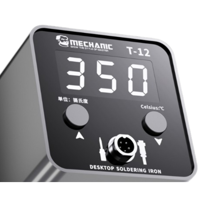 The Mechanic T12 Simplex (or MC T12 Simplex) is a compact and intelligent digital soldering station focused on quick, accurate soldering for electronics repair and hobby work. It uses the widely compatible T12 series heating tips, allowing flexibility in tip selection. The unit offers fast heating, memory settings, and precise temperature control. Its small, all-metal design helps with heat dissipation, and an LED display provides clear feedback on the current and set temperatures. With its “sleep” or “hibernate” mode, the station reduces tip wear when idle. Overall, it is meant to deliver high performance in a smaller footprint for PCB, mobile, and precision soldering tasks