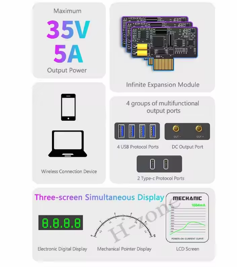 The Mechanic A210 Max is a dual-handle soldering station designed for enhanced productivity in electronics and mobile repair applications. It supports two soldering irons (dual channels) operating simultaneously with individual temperature control. The unit uses C210 / T210 style heating tips and offers fast heating (claimed 2 seconds to reach working temperature). It includes a dual LED display (one for each iron), 5-gear memory modes, fuse / short-circuit protection, and compact construction using aluminum alloy for heat dissipation and durability. It's intended for use in scenarios where two irons are needed (e.g. one for soldering, one for desoldering) to speed up workflow.