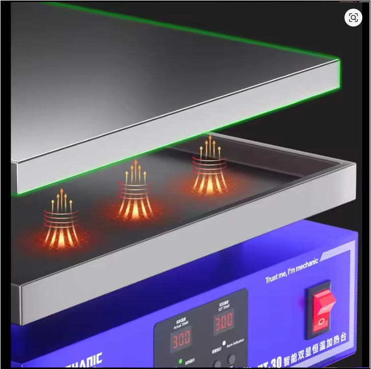 The MC HT30 Heating Platform is a professional-grade preheating device engineered for efficient PCB, smartphone, and tablet motherboard repairs. It features a high-power heating plate that delivers fast, consistent, and evenly distributed heat across a larger surface area, making it ideal for adhesive softening, IC removal, tin reflow, and bonding operations. Its precise temperature control protects sensitive electronic components from overheating while ensuring smooth repair processes. Built with a durable metal body, non-slip base, and a wide heating area, the HT30 is designed for heavy-duty use in repair workshops requiring high performance and reliability.
