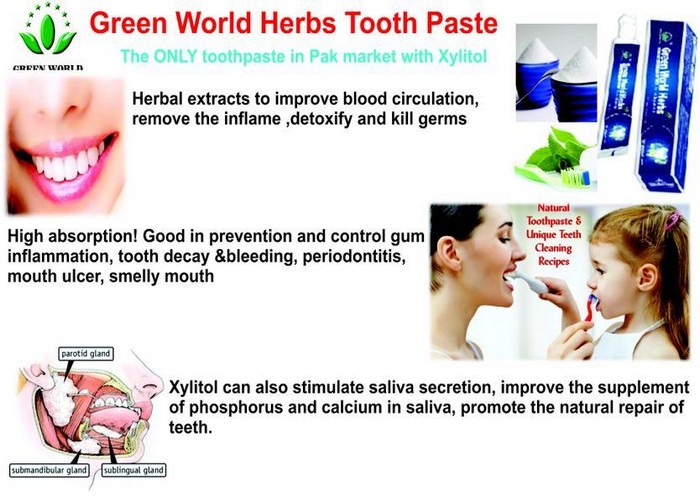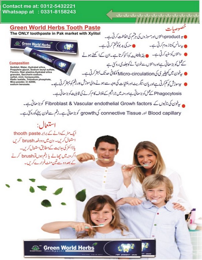 Green World Herbs Product Provides All-in-one Dental Care. Green World Herbs Product Refreshes Your Breath and Whiten Your Teeth. This Herbs Tooth Paste Activate Blood Platelet Promote Platelet Aggression, and Restrain Bleeding Quickly .green World Tooth Paste is Herbal That Promote the Generation of Basic Fibri blast Growth Factors and Vascular Endothelial Growth Factors. These Herbs Pastes Accelerate Blood Capillary Growth And Connective Tissue Proliferation, Heal The Bleeding Wound Surface Thus Prevent Further Pathological Changes. Green World Herbs Paste Improves The Phagocytosis Significantly and Enhance The Anti-pathogens Capability of Oral Tissues Green World Tooth Paste Counteract Inflammations Caused by Multiple Inflammatory Agents Significantly and Alleviates Swelling and Fester Caused by Inflammatory Exudation Green Herbs Paste is the Good Option to Improve Micro-circulation of Blood Capillary Significantly. Without Wounding Gums, Provide Deep and Full Cleaning of Teeth. Softly Massing, Delete a Raid Between Teeth and Along the Line of Gums.