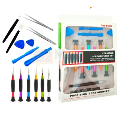 The KC 1688 (SW-1688) Toolkit is a compact and convenient electronics repair kit tailored for mobile devices, laptops, tablets, and other small gadgets. It includes a multifunction handle (often magnetic), an extension or flexible shaft, and an assortment of precision bits (e.g., Philips, flat, Torx, star, and pentalobe), plus pry tools, tweezers, and scrapers. The bits are usually made of hardened steel or S2 alloy, and the kit is built into an organised plastic case for portability. It’s designed to allow technicians or hobbyists to carry a broad range of bit types in one kit, easily swap bits, and access tight screws in delicate electronics.